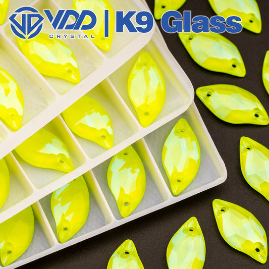 VDD 10x20mm Leaf Neon Lemon K9 Glass Sew on Rhinestones Sewing Crystal Flat Back Stones for Clothes Decorations Wedding Dress